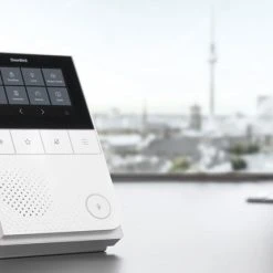 The DoorBird Indoor Station has a touch display made of scratch-resistant tempered Gorillaยฎ glass with an intuitive user interface. It also includes configurable hard buttons with clear symbols for common functions.